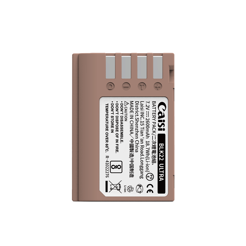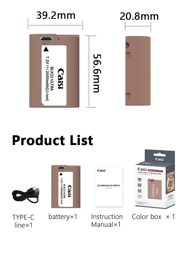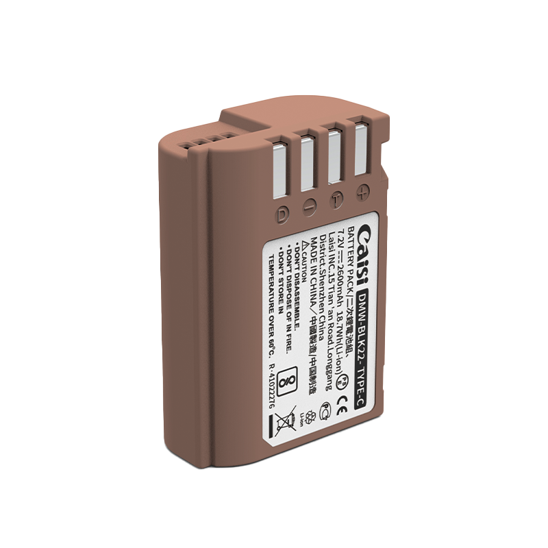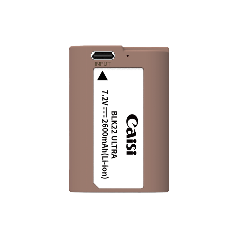 Power any Panasonic camera that uses DMW-BLK22 batteries with this DMW-BLK22 USB-C Battery from Caisi. The fully decoded DMW-BLK22 battery features a 2600mAh, 18.15Wh capacity and provides a 7.2V output. A 5V, USB-C input allows you to charge the battery to 100% in about 2.5 hours with any USB adapter or power bank.