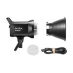 It has an intuitive design that incorporates a rear LCD monitor and dial for 0-100% dimming adjustment as well as a FX dial for access to a couple of lighting effects from this light. Now with wireless control you can operate this light from a distance via a Bluetooth connection and the Godox light control app. The front of the light sports a universal Bowens mount for integrating a wide range of accessories from any manufacturer. The fixture is ready for worldwide with its 100-240V power supply.