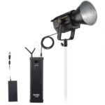 The controller box has dual V-mount battery plates and an LCD display that adjusts the light body locally. Additionally, a radio remote adjusts the settings wirelessly and a a Bluetooth antenna for using the GodoxPhoto app on iOS or Android portable devices.
