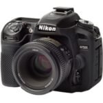 Slim and smooth, this Silicone Protection Cover in black for the Nikon D7500 protects your camera body from bumps, scratches, sand, and dust. The custom-fit silicone skin provides a secure grip.