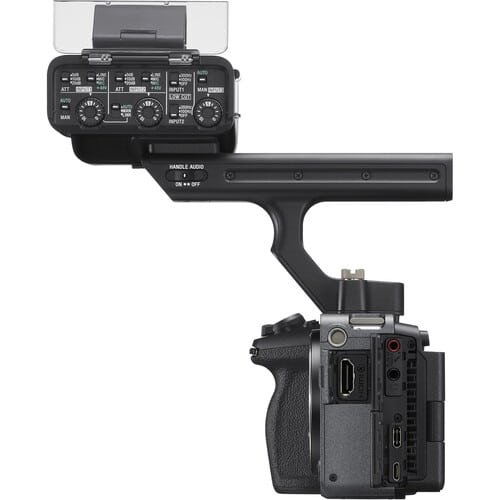 A handle equipped with an XLR adaptor with two full size XLR terminals can be attached to the Multi Interface (MI) Shoe on the camera for more comfortable and stable camerawork in difficult shooting situations, such as low-position shots.